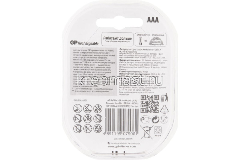 Батарейка GP Accu AAА аккумул. 1000ma в интернет-магазине «Мастер Крепежа» по цене 389 руб. Более 8 наименований товаров в наличии в категории Батарейки для зарядных устройств / ЗУ . Купить батарейка gp accu aaа аккумул. 1000ma в Чебоксарах выгодно Вы можете on-line на нашем сайте, или отправив заявку по почте, а также по телефону или в пункте выдачи компании г. Казань, ул. Татарстан, 9, магазин "Мастер Крепежа". Доставка по Республике Татарстан и другие регионы РФ.