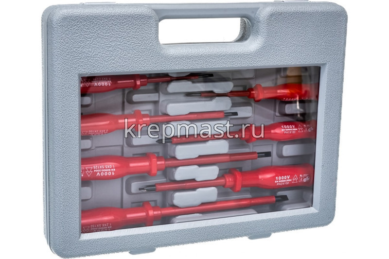 Набор изолированных отверток 8 шт. применяется для монтажа различных резьбовых соединений. В комплект входит семь диэлектрических отверток с наконечниками типа PH и SL, и одна отвертка для работ под напряжением до 220 В. Каждый предмет имеет удобную рукоятку. Для удобного хранения отверток, набор комплектуется пластиковым чемоданом.
