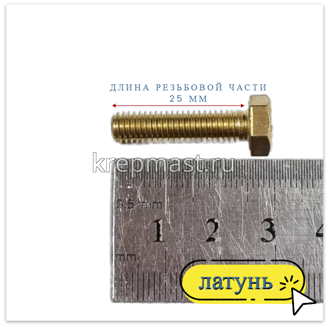Болт 6х25 DIN 933 латунь в интернет-магазине «Мастер Крепежа» по цене 53 руб. Более 26 наименований товаров в наличии в категории Болты латунные DIN 933. Купить болт 6х25 din 933 латунь в Чебоксарах выгодно Вы можете on-line на нашем сайте, или отправив заявку по почте, а также по телефону или в пункте выдачи компании г. Казань, ул. Татарстан, 9, магазин "Мастер Крепежа". Доставка по Республике Татарстан и другие регионы РФ.
