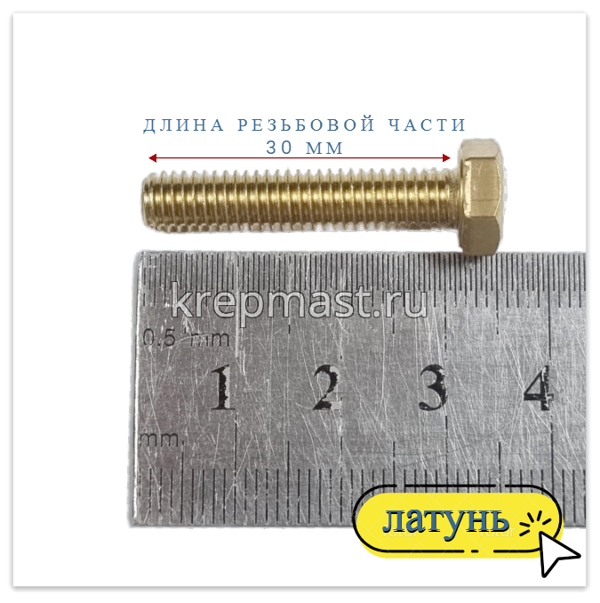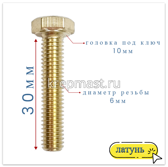 Болт 6х30 DIN 933 латунь в интернет-магазине «Мастер Крепежа» по цене 61 руб. Более 26 наименований товаров в наличии в категории Болты латунные DIN 933. Купить болт 6х30 din 933 латунь в Чебоксарах выгодно Вы можете on-line на нашем сайте, или отправив заявку по почте, а также по телефону или в пункте выдачи компании г. Казань, ул. Татарстан, 9, магазин "Мастер Крепежа". Доставка по Республике Татарстан и другие регионы РФ.