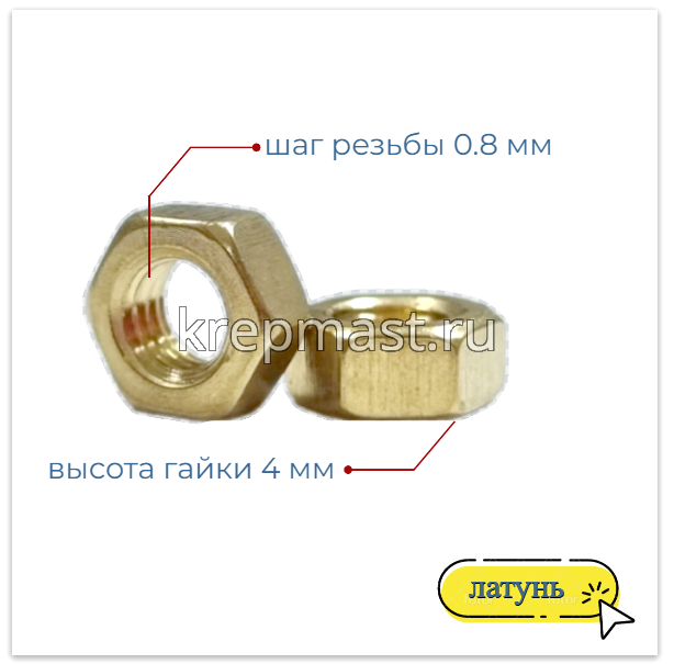 Гайка 6-гр. М 5 (0,8) латунь DIN 934 в интернет-магазине «Мастер Крепежа» по цене 18 руб. Более 7 наименований товаров в наличии в категории Гайки латунные DIN 934 (ГОСТ 5927) . Купить гайка 6-гр. м 5 (0,8) латунь din 934 в Чебоксарах выгодно Вы можете on-line на нашем сайте, или отправив заявку по почте, а также по телефону или в пункте выдачи компании г. Казань, ул. Татарстан, 9, магазин "Мастер Крепежа". Доставка по Республике Татарстан и другие регионы РФ.