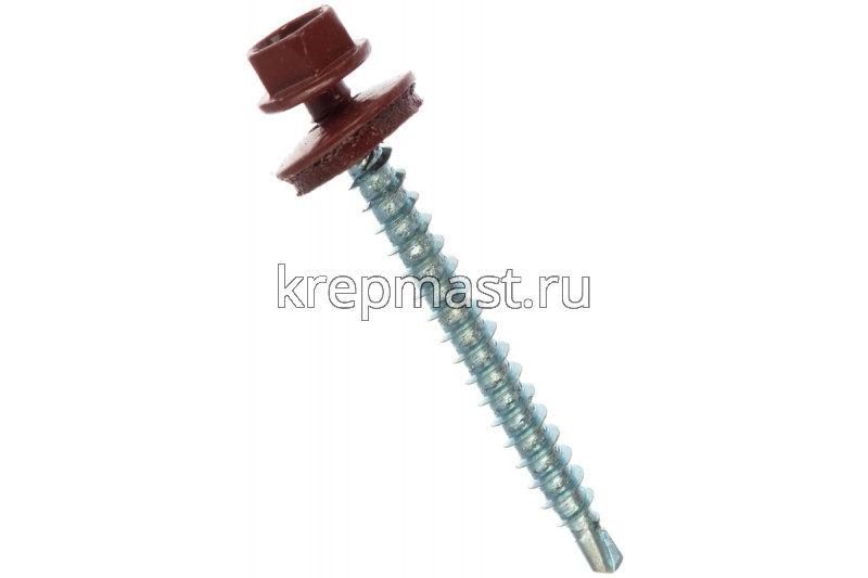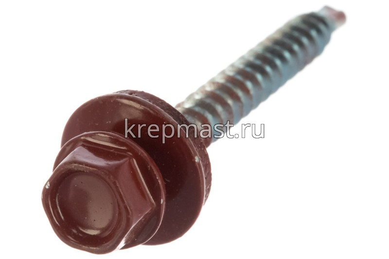 Кровельный саморез окрашенный с шайбой и резиновой прокладкой EPDM DIN 7504 4,8 х 51 по дереву RAL 3009 (цвет темно - красный) - представляет из себя саморез с шестигранной головкой, фланцем и резиновой прокладкой для эффективного прижатия листового металла к основанию.
