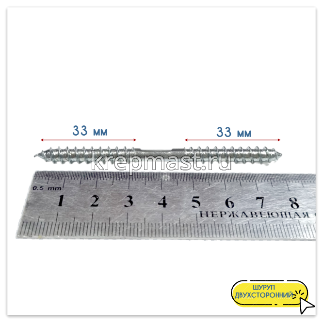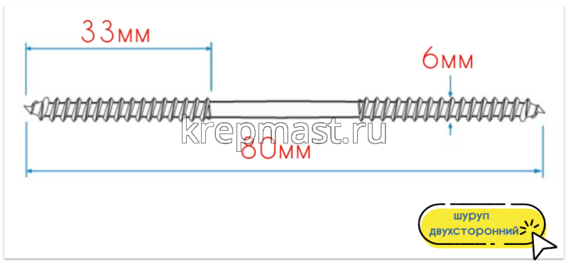 Двусторонний шуруп изготавливается из высококачественной инструментальной стали марки С10008. Для защиты от негативного воздействия влаги и появления коррозии, саморез с двухсторонней резьбой покрывается тонким слоем белого цинка (горячее цинкование).