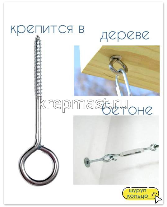 Шуруп-кольцо 4,0 х 50применяется для монтажа в бетонные и кирпичные основания с помощью пластиковых дюбелей, а также в деревянные конструкции, в предварительно просверленное отверстие. Шуруп-кольцо используется для монтажа тросов и канатов, фиксации легких строительных лесов и стеллажей к стенам, а также для подвешивания предметов к потолку и стенам.