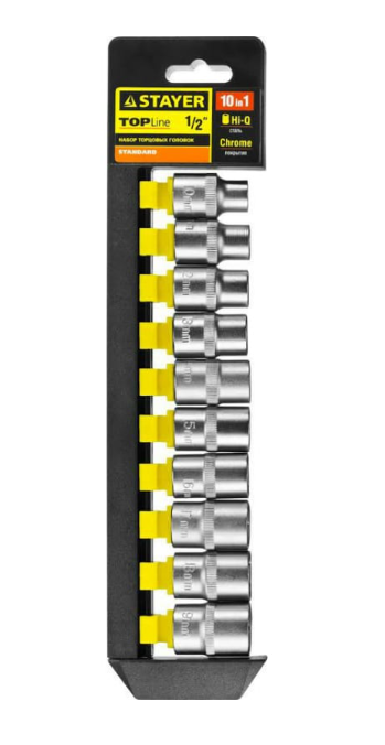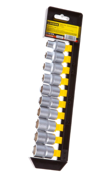 Набор STAYER головок торцевых 1/2" (10-19мм) 10 предметов применяется в мастерской, гараже для проведения ремонтных работ. Изготовлены из закаленной инструментальной стали с хромированным покрытием, защищающим оснастку от коррозии. Головки располагаются на пластиковом рельсе для удобства хранения и переноски.