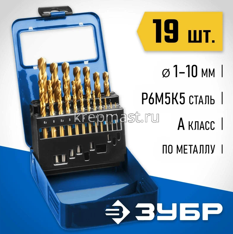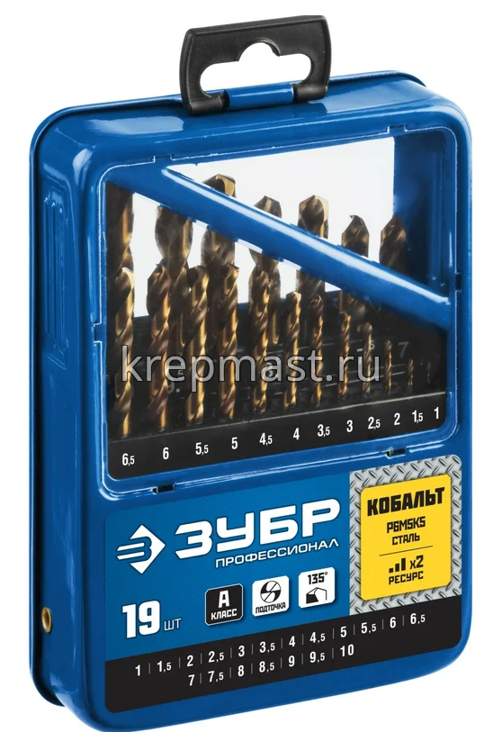 Набор сверел по металлу 19шт ЗУБР (1-10мм) КОБАЛЬТ металлический бокс с добавлением кобальта 5% предназначен для профессионального использования. Класс точности сверел А1. Цилиндрический хвостовик. Угол заточки 135°.