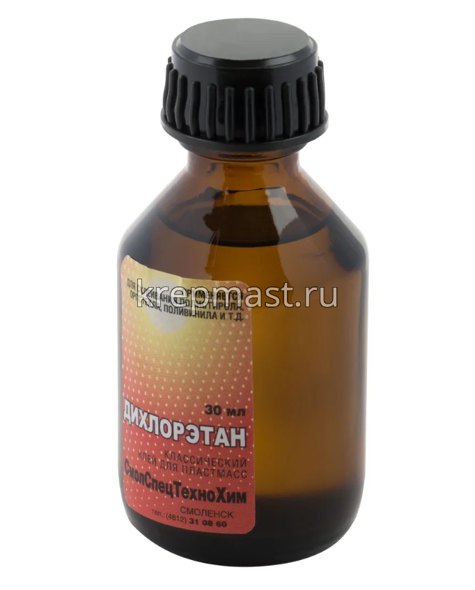 Клей для пластмассы Дихлорэтан ДХЭ, 30мл применяется для склеивания корпусных поверхностей из пластмассы, для использования в качестве растворителя, а также для обезжиривания различных материалов. Клей не растворяется в воде и представляет собой прозрачную легковоспламеняющуюся жидкость, которая имеет сладковатый запах.