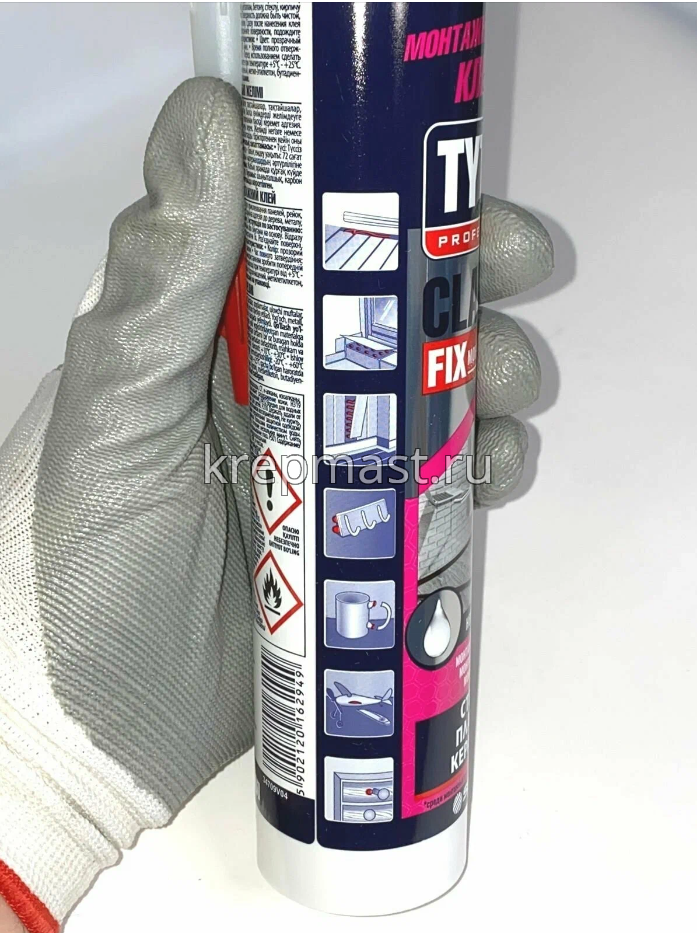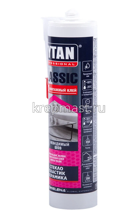 Клей монтажный Tytan professional Classic Fix, униыерсальный, 310 мл многоцелевой прозрачный монтажный клей на базе синтетического каучука. Рекомендуется для большинства строительных материалов для финишных и реконструкционных работ. После отверждения образует эластичный и прозрачный шов. Имеет отличную адгезию к типичным строительным основаниям: бетон, древесина, кирпич, штукатурка. Применяется для монтажа тяжелых и легких материалов, элементов декора, изделий из пенополиуретана, древесины и ее производных, металла, стекла, твердых пластиков (ПВХ, АБС, поликарбоната). Не подходит для полиэтилена, полипропилена, пенополистирола и поролона.